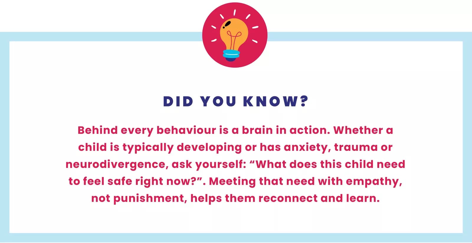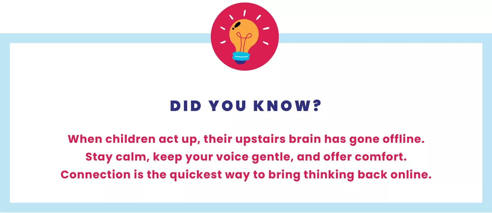 When we talk about a child’s ‘upstairs brain’, we mean the part that helps them think clearly, solve problems and manage their feelings. It’s where focus, memory and self-control live. But the upstairs brain is delicate. When a child feels safe and comforted — through a calm word, a steady routine or a caring touch — it stays switched on. That’s when they can listen, learn and make good choices.