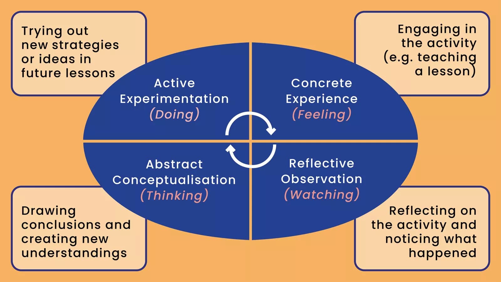 Another useful framework is Kolb’s Experiential Learning Cycle, which emphasises learning through experience to inform future practice.