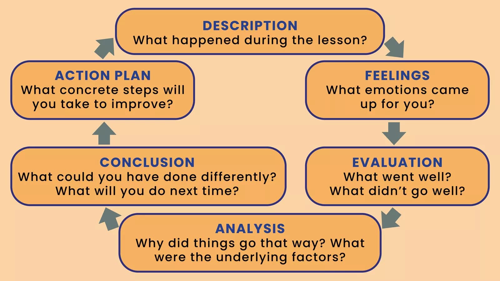 Several frameworks can guide meaningful reflection. One is Gibbs’ Reflective Cycle, which breaks down the reflective process into clear, manageable chunks.