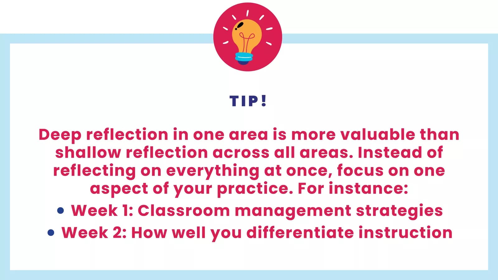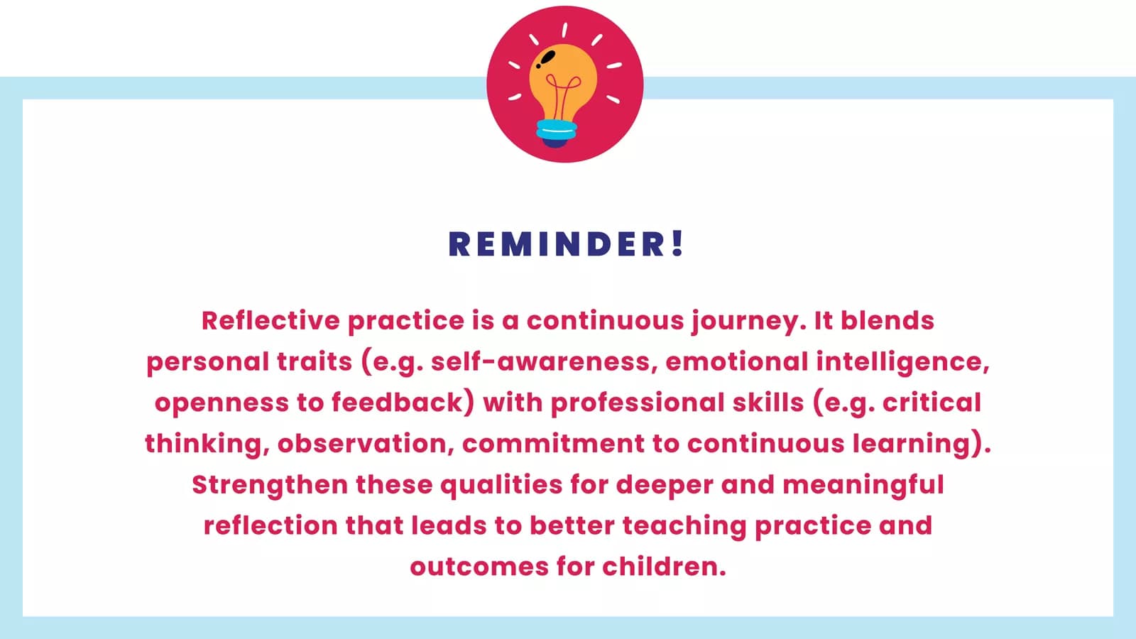 - Chronic struggles: Persistent issues or challenges (e.g. classroom management or children’s engagement) may signal areas needing deeper reflection.