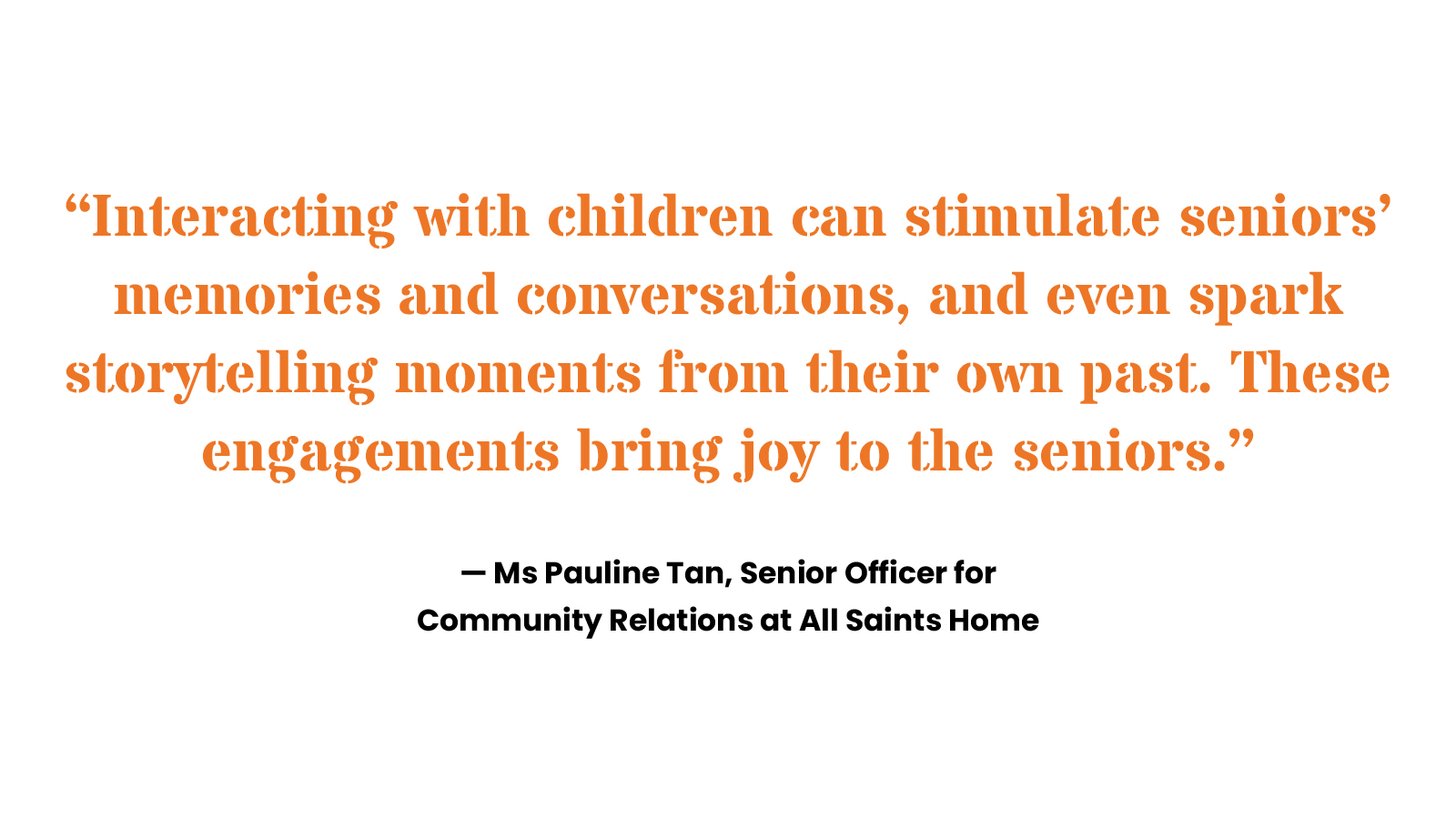 Pauline Tan, Senior Officer for Community Relations at All Saints Home, emphasised that these interactions are vital for the seniors’ psychosocial and mental well-being, preventing them from feeling isolated or lonely.