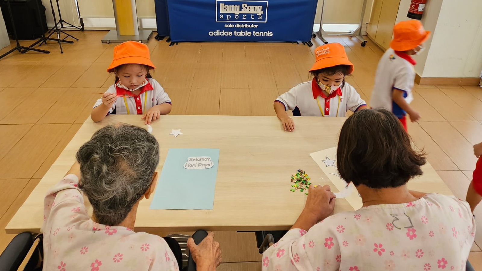The children from PCF Sparkletots @ Boon Lay Blk 262 engaging in arts and crafts activities with the elderly.