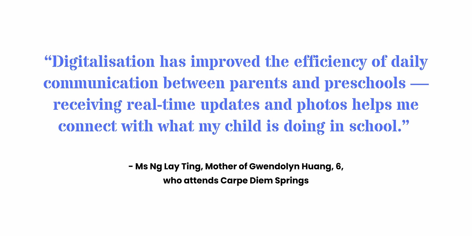 Having been an educator for 12 years, Ms Farah recalls a time when physical consent forms were handed out to parents and children’s daily attendance was manually recorded with pen and paper. In the past, teachers would collect cash for field trips, dispense change, and remind parents to submit consent forms. Digitalisation has streamlined these processes. With an app, parents can pay digitally, access and sign consent forms online as well as receive reminders for submission.