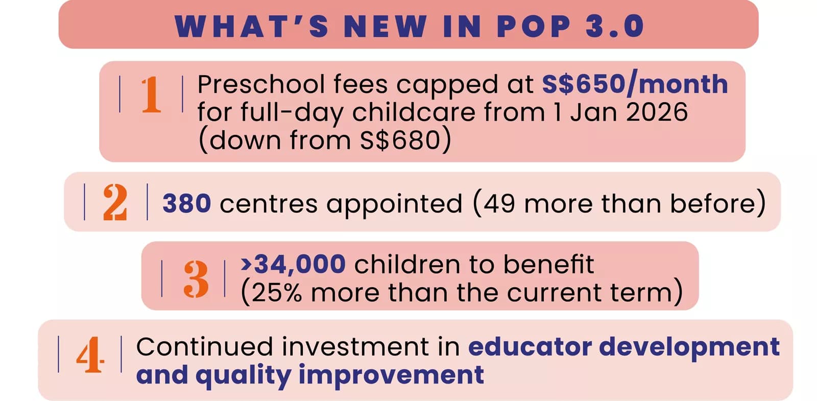 On 31 October 2025, ECDA announced the renewal of the POP scheme for a third term from 1 January 2026 to 31 December 2030. This scheme provides funding support to appointed centres to improve the accessibility, affordability and quality of childcare and infant care services.