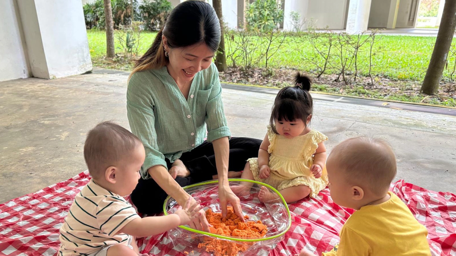 Ms Seet speaks enthusiastically and makes expressive faces, like smiling widely, to motivate infants to explore the texture of coloured sand.