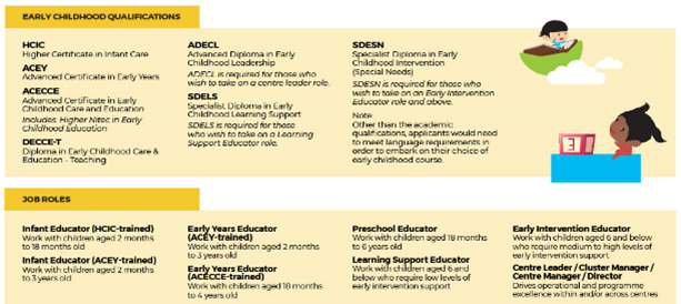 This induction booklet provides information to help you better assimilate into your new working environment. Designed to complement your employer’s induction programme, we have included a brief overview of the Early Childhood sector to facilitate your understanding of an Early Childhood Educator’s role and prospects for development at different stages.