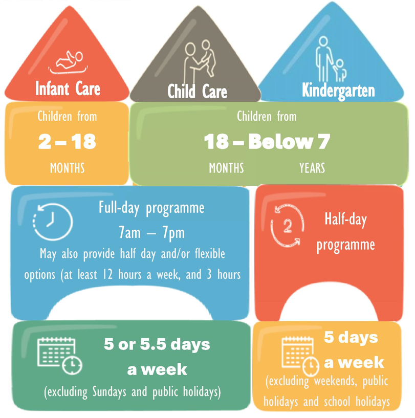 ECDA-licensed preschools provide care and education for children between 2 months and below 7 years. Here is an overview of the types of services that may be offered in a preschool: