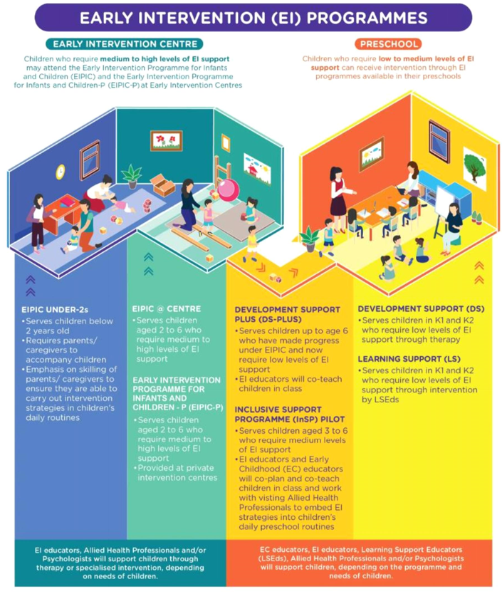 Today, children under the age of seven with developmental needs can receive support through a range of Early Intervention (EI) programmes depending on their needs. The DS-LS, DS-Plus and EIPIC programmes are funded by the Government today. Families may also tap on other privately-provided EI services to support their children’s developmental needs.