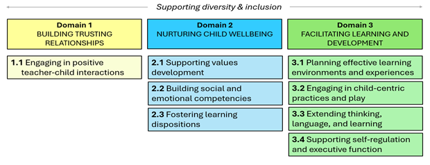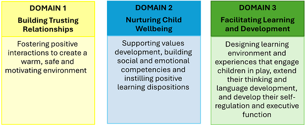 The indicators in each sub-domain are closely aligned to the Skills Framework for Early Childhood (SFw EC), as well as our local learning and development frameworks, i.e. the Early Years Development Framework (EYDF) and Nurturing Early Learners (NEL) Framework.