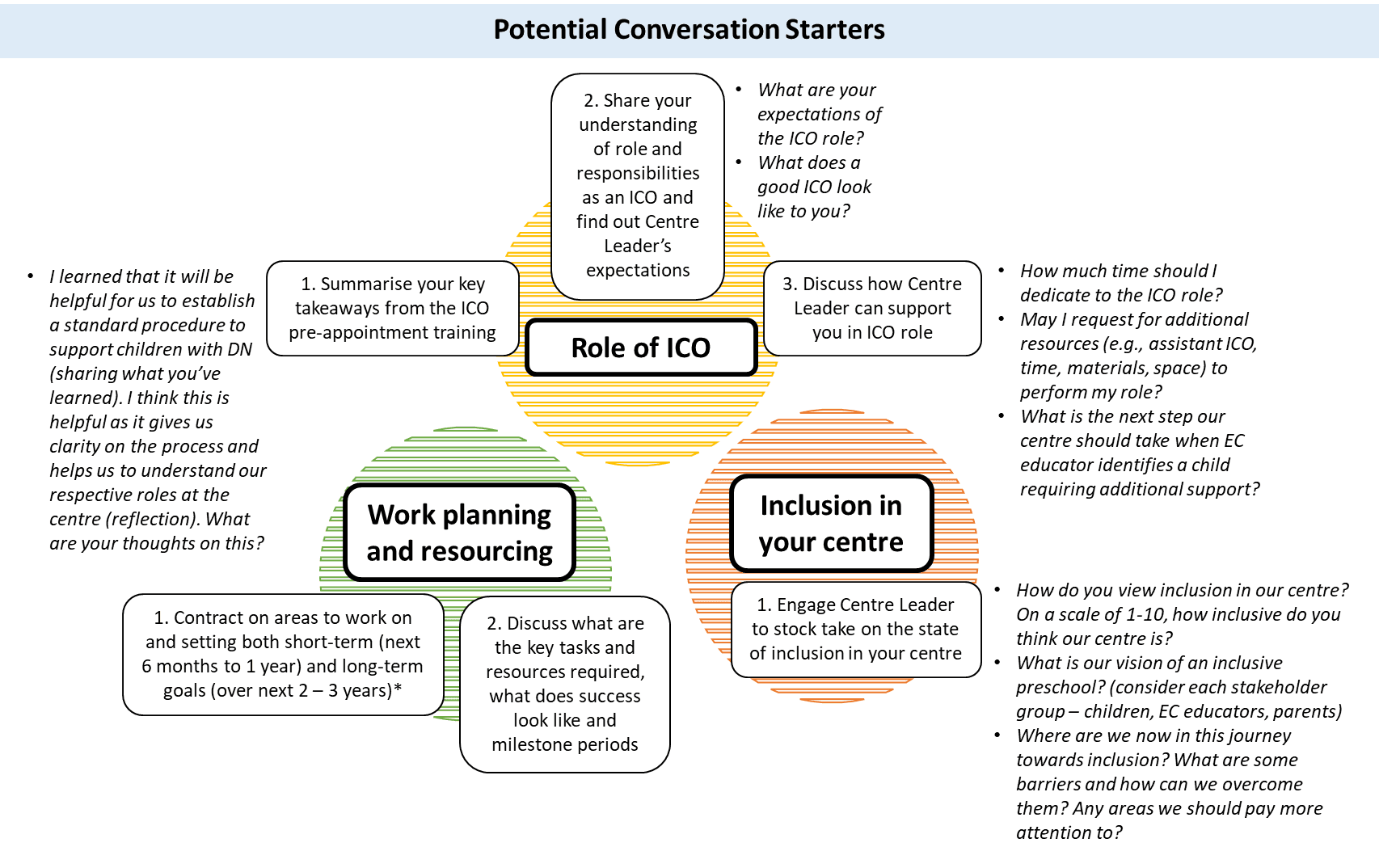 To kick start the inclusion journey in your centre, it is important to check in with your centre leader on their expectations of the ICO role and direction for the centre. The following provides you with a possible roadmap on how to kick start the conversation with your centre leader.