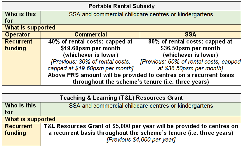 5. The existing Portable Rental Subsidy Scheme and the Teaching & Learning (T&L) Resources Grant will be extended and enhanced. These schemes help preschools, which are not Anchor Operators (AOP) or Partner Operators, defray rental costs and support their quality improvement efforts, respectively. Please see Annex B for details.