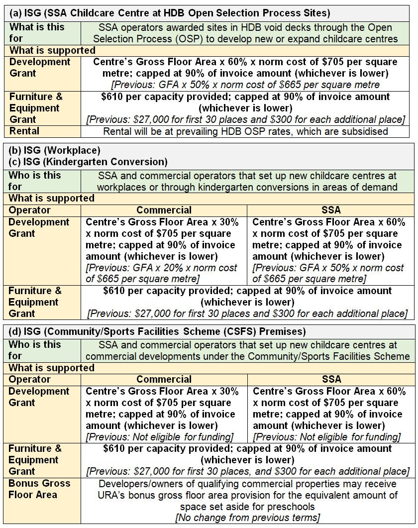 4. In addition, the Government will open up the ISG to new childcare centres at Community/Sports Facilities Scheme (CSFS) premises. Under CSFS, bonus gross floor area allowance is currently provided to developers/owners of qualifying commercial developments, to incentivise them to set aside space for childcare centres.