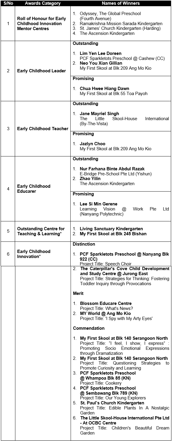 Annex A). The Awards are given out annually to recognise early childhood professionals and centres that have excelled in teaching and learning, and in their innovative practices.