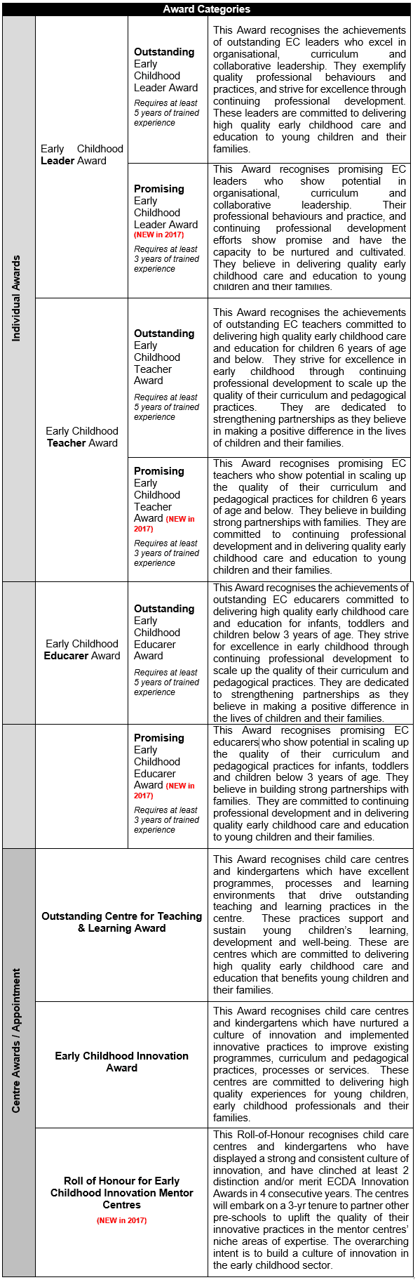 For individual awards, the nomination is open to all Singapore citizens or permanent residents who are in-service ECDA-certified educarers/teachers/centre leaders, who meet the specific training and experience stipulated in the ECDA Awards nomination forms for the respective Awards categories. Nominees for the ‘Promising’ award categories are required to have at least 3 years of trained experience. The ‘Outstanding’ awards categories are open to individuals who have at least 5 years of trained experience.