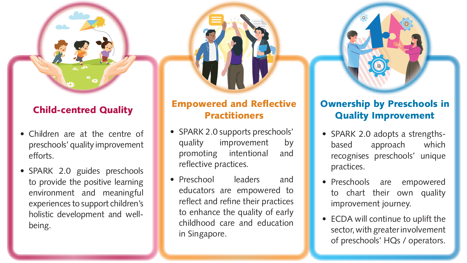 SPARK 2.0 is built upon three key tenets, namely, child-centred quality, empowered and reflective practitioners and ownership in quality improvement: